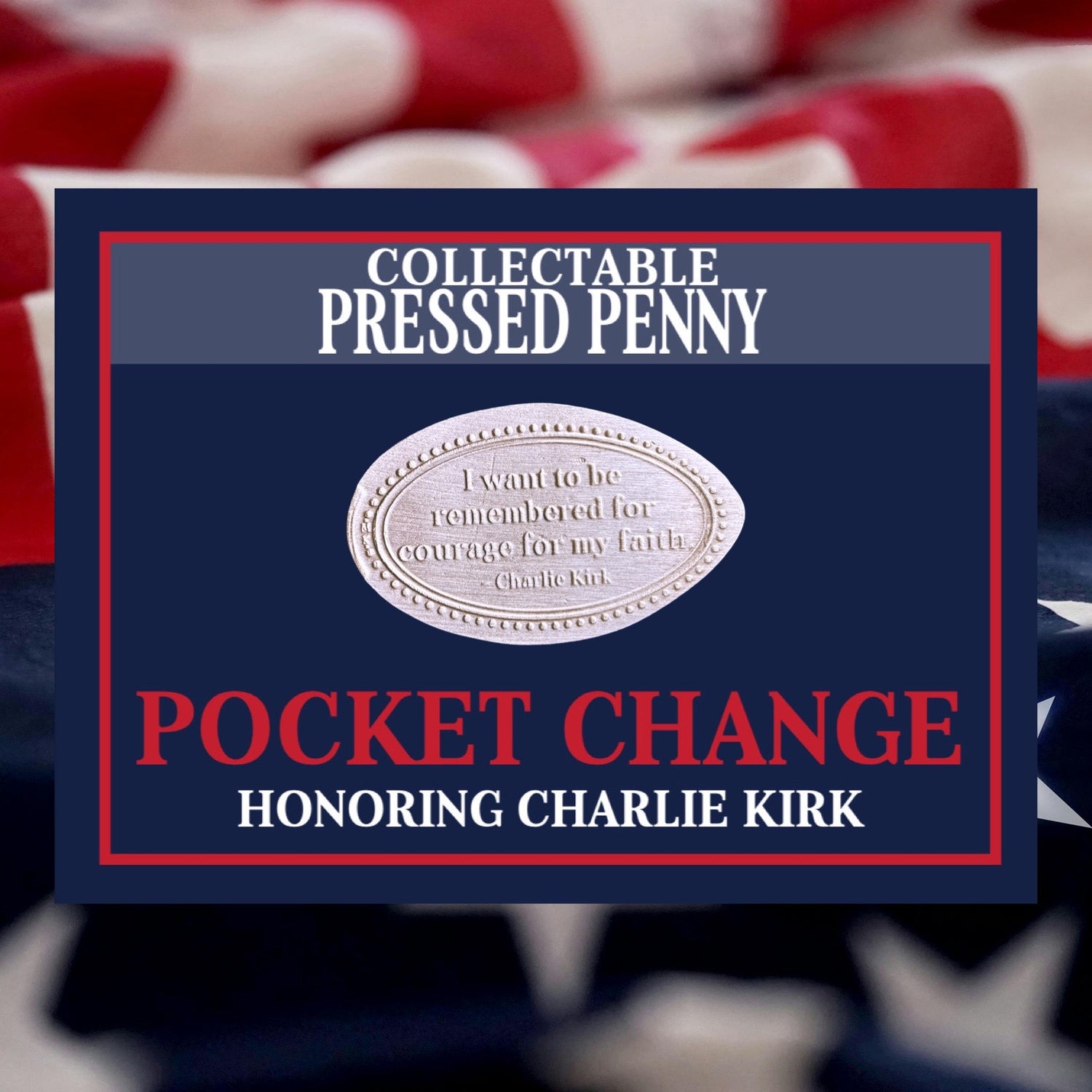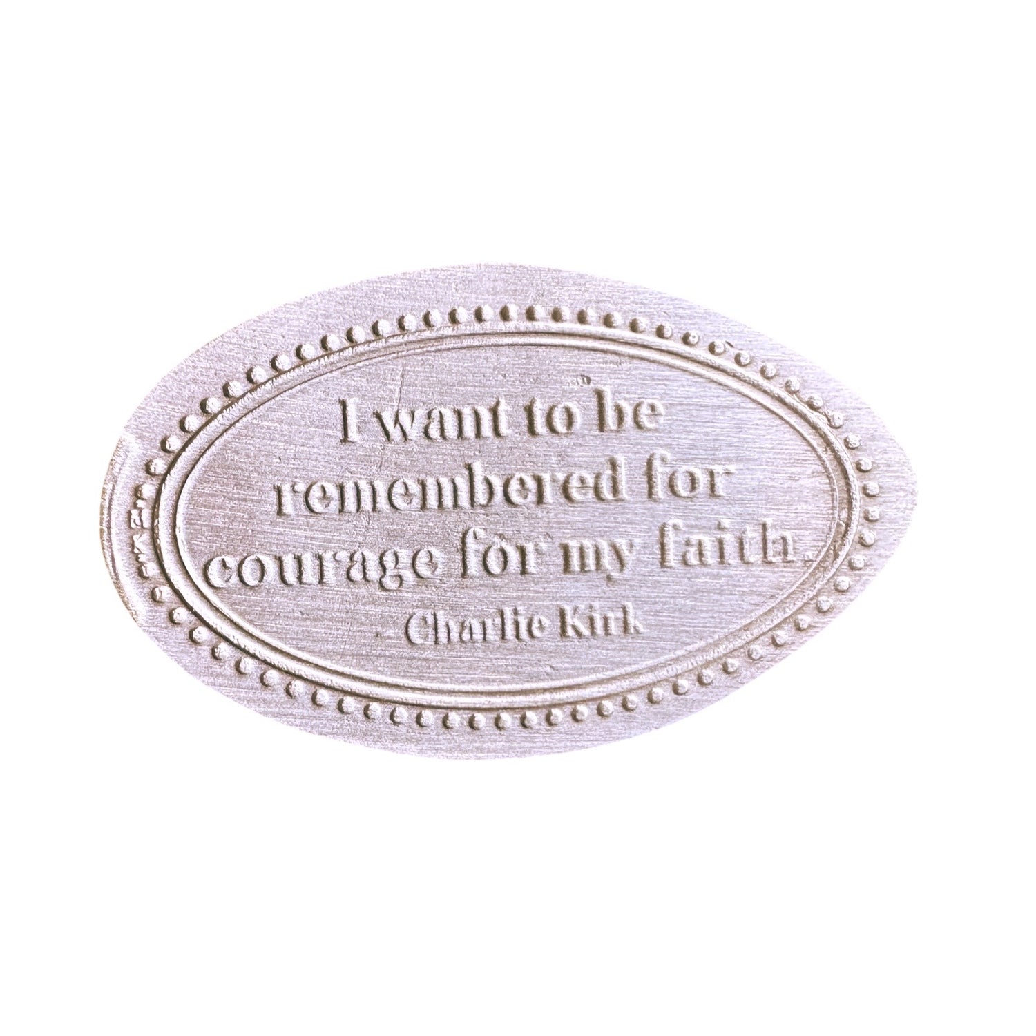 This Pocket Change pressed penny features Charlie Kirk’s words: “I want to be remembered for courage for my faith.” A lasting tribute to his strength and devotion to Jesus. A meaningful piece for collectors who value faith, patriotism, and courage.