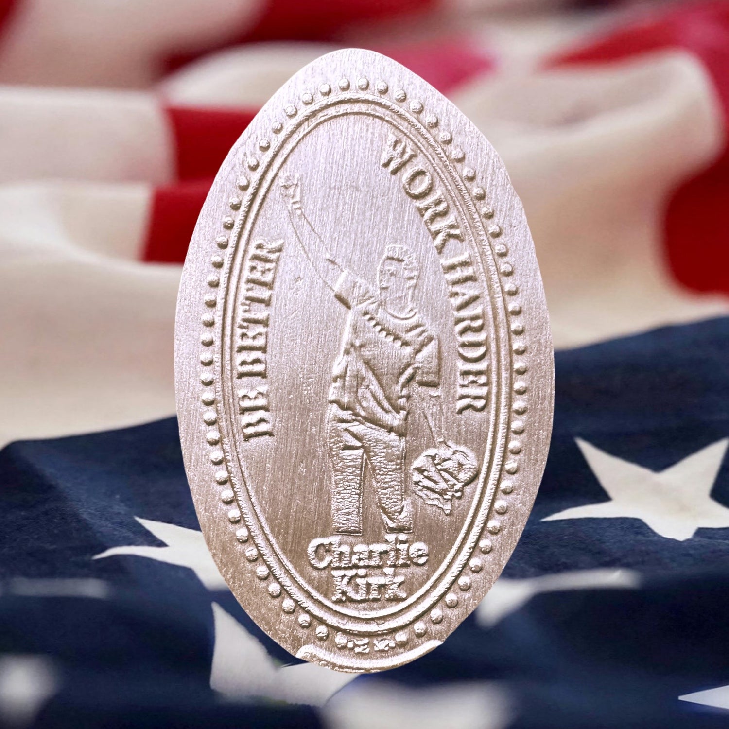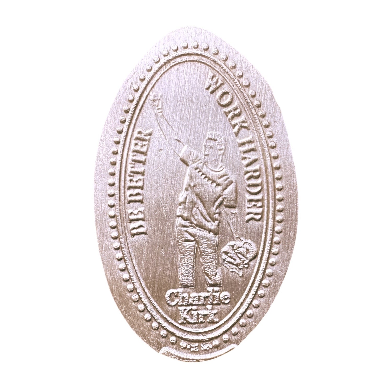 This Pocket Change pressed penny captures Charlie Kirk’s encouragement: “Work Harder, Be Better.” The design also features artwork of him tossing hats into the crowd—a signature of his events. A bold keepsake blending faith, leadership, and inspiration.